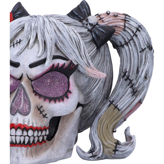 Desata un aura de belleza cautivadora con la calavera de muñeca Frankenstein de Nemesis Now. Esta cautivadora creación encarna la esencia del encanto gótico, meticulosamente elaborada para cautivar la imaginación de tu clientela más exigente. Pintada a mano con precisión y fundida en la resina más fina, la calavera irradia una calidad y atención al detalle inigualables. Adornada con ojos brillantes, puntadas intrincadas y detalles de patchwork, el audaz maquillaje femenino y las coletas grises añaden un toque de encanto enigmático a esta obra maestra de estilo Frankenstein. Presentada en una llamativa caja de regalo de la marca Drop Dead Gorgeous, esta calavera no solo es una adición fascinante a cualquier colección, sino también un artículo de exhibición cautivador que llamará la atención en tu tienda. Ideal para coleccionistas de calaveras y amantes de los regalos espeluznantes, esta escalofriante obra maestra está lista para convertirse en un éxito de ventas en tu espacio comercial. Llena tus estantes con la calavera de muñeca Frankenstein de Nemesis Now y eleva tus ofertas con su elegancia macabra.