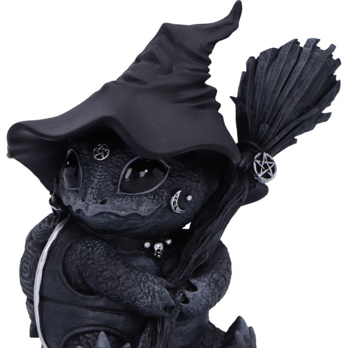 Shellial es una encantadora figura de tortuga que combina a la perfección ternura y encanto. Vestida con un sombrero de bruja y agarrando una escoba, se sienta felizmente con su pequeño caparazón a la espalda.